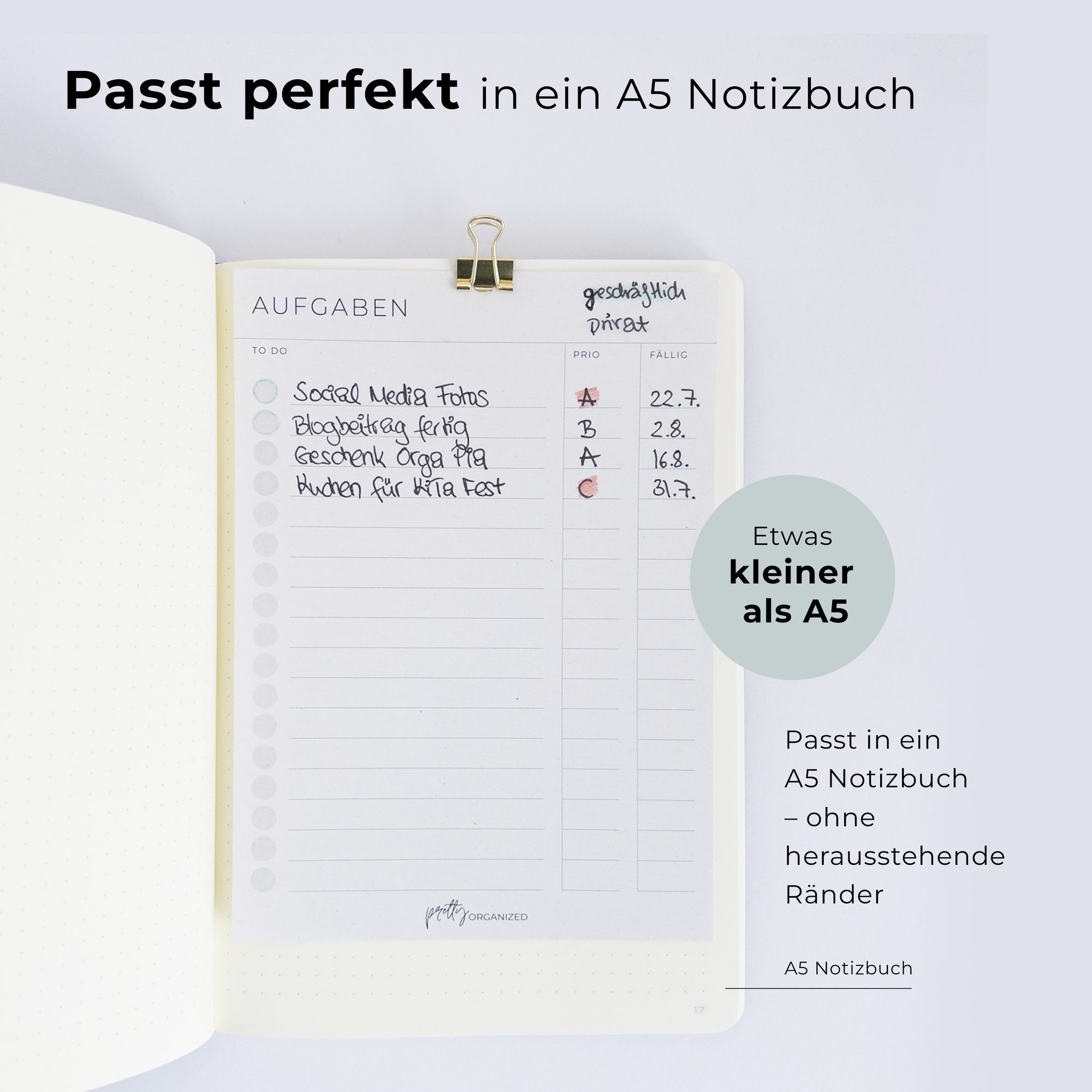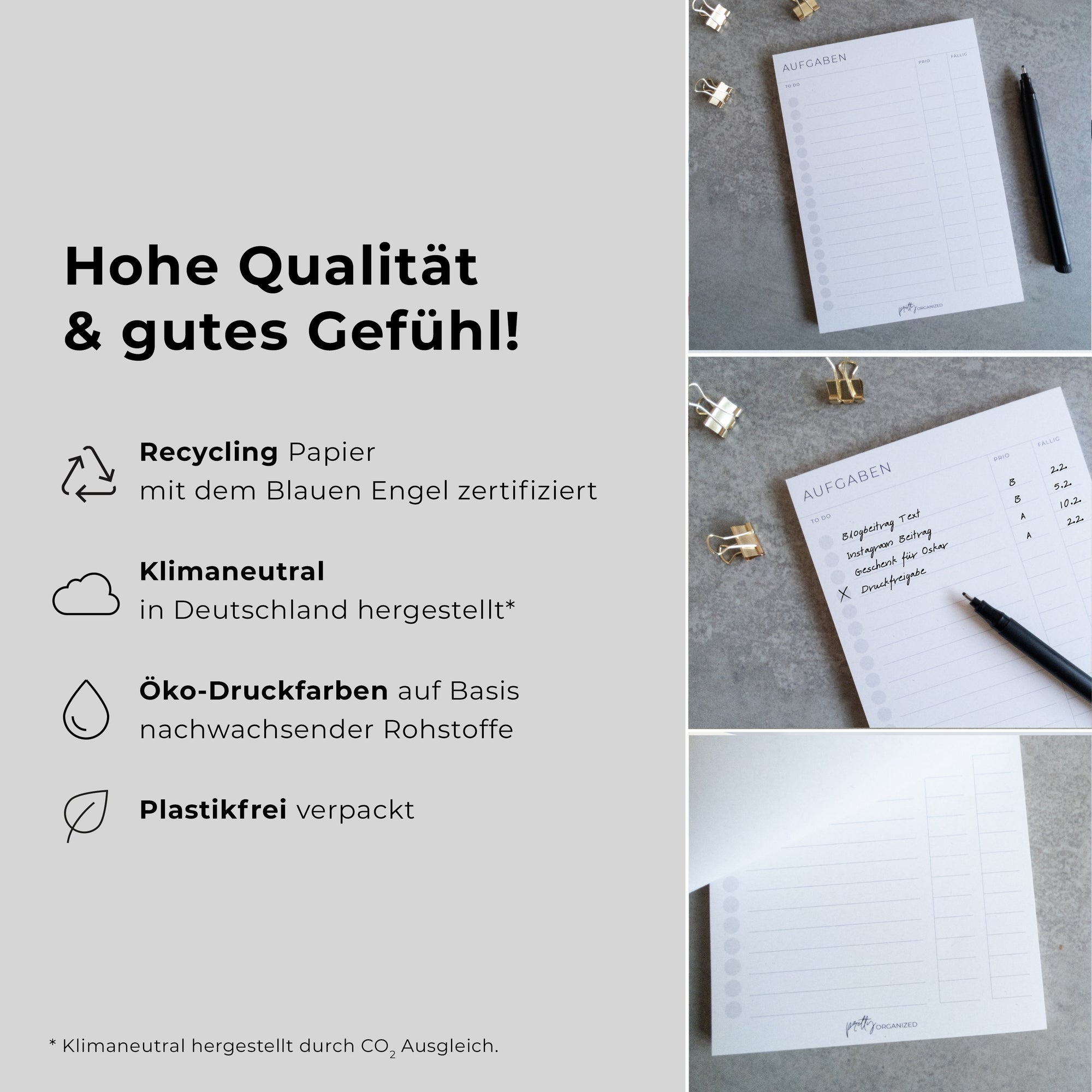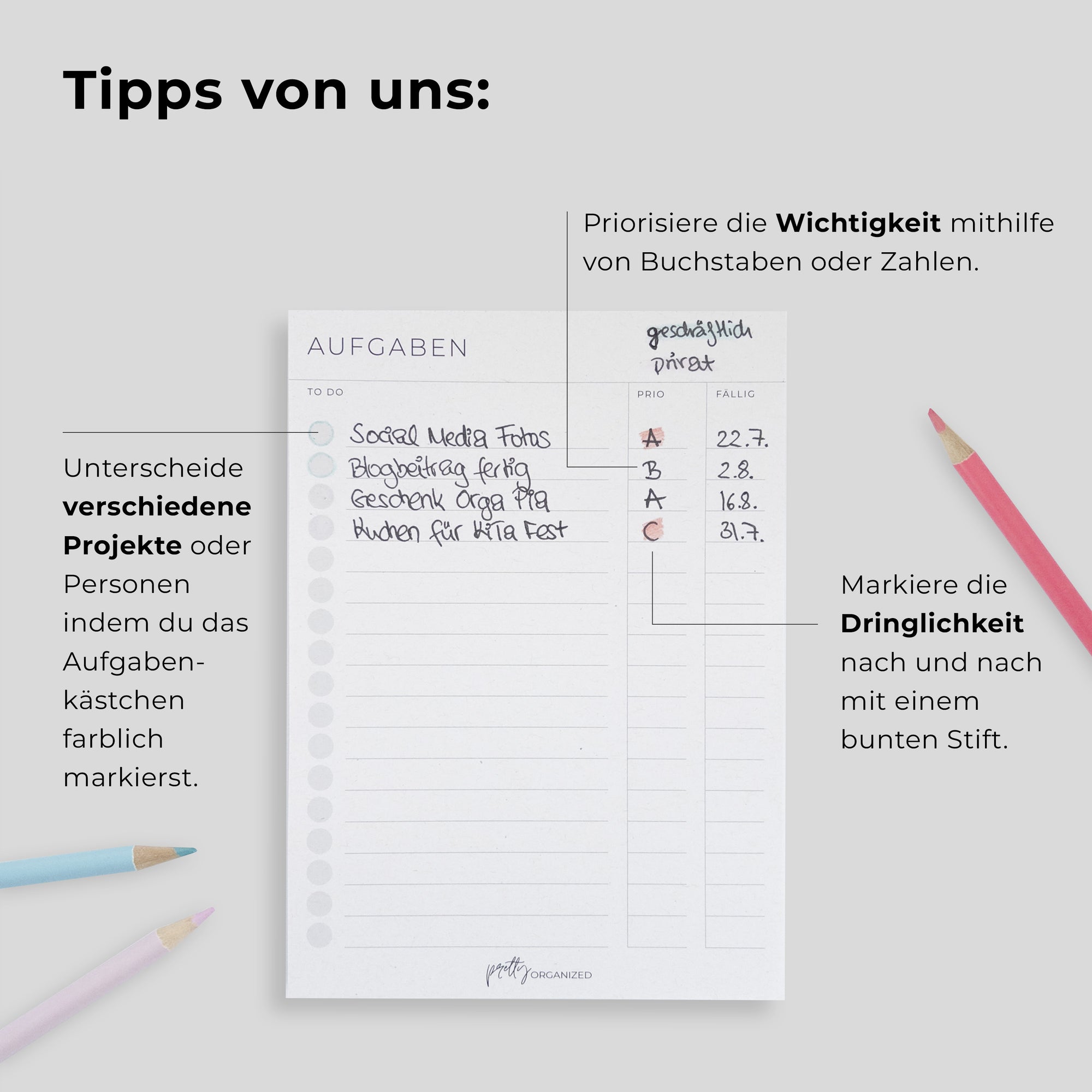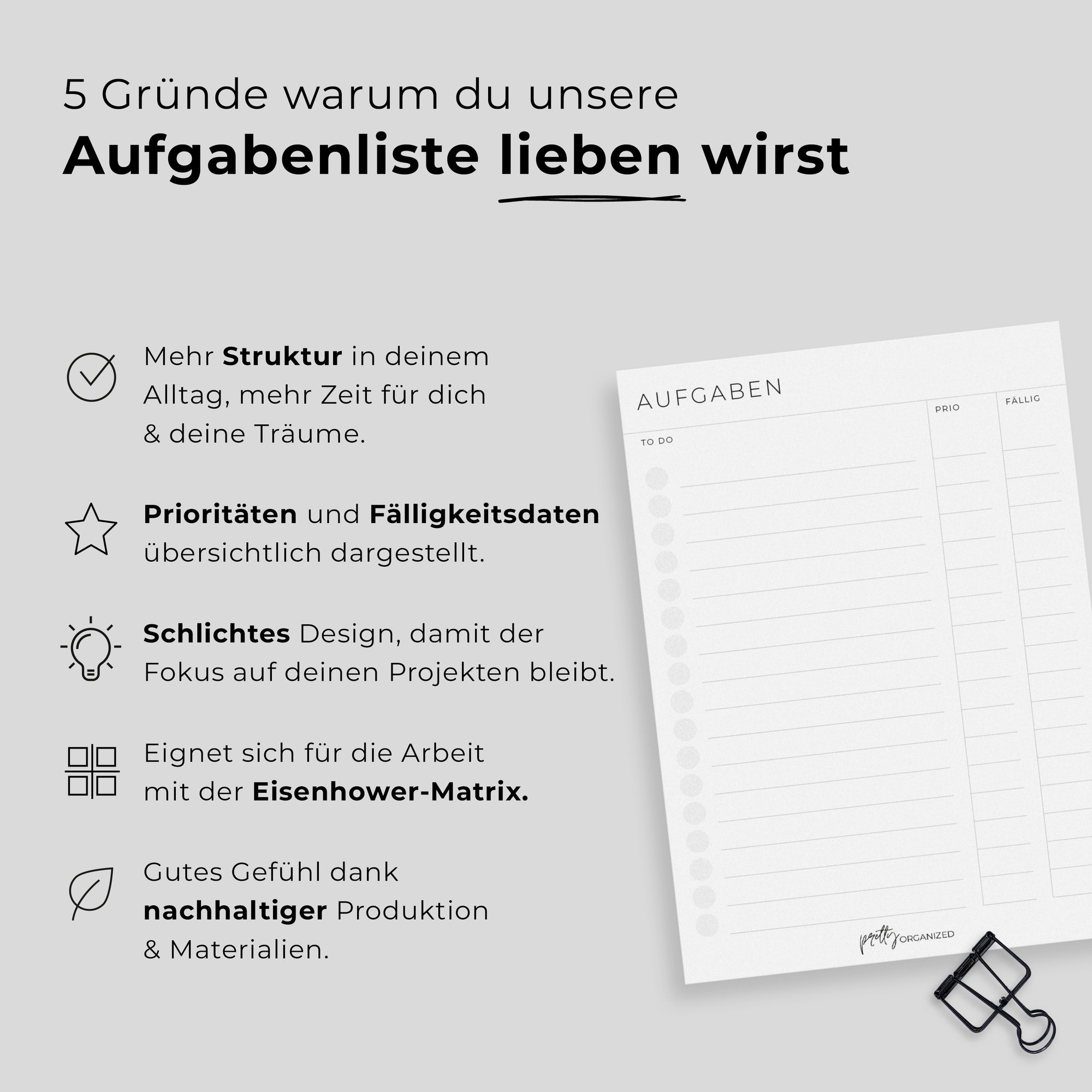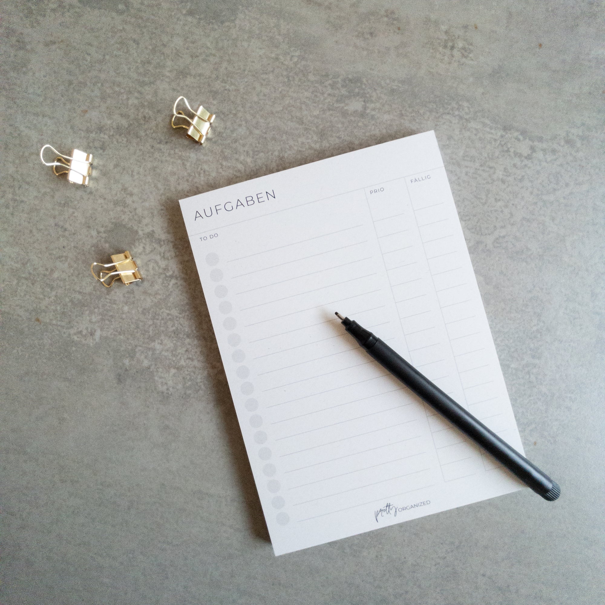 links unten / niedrige Dringlichkeit und niedrige Wichtigkeit: Diese Aufgabe ist weder wichtig noch dringend - daher solltest du dich ernsthaft fragen, ob du sie überhaupt erledigen musst oder einfach von deiner To-do-Liste streichen kannst. Typischerweise sind dies Aufgaben, die du immer wieder vor dir her schiebst, da andere Dinge wichtiger sind. Bei uns landet eine solche Aufgabe z.B. immer wieder im Feld "für später" auf deinem prettyORGANIZED Wochenplaner oder schafft es gar nicht erst von deiner Aufgabenliste herunter.